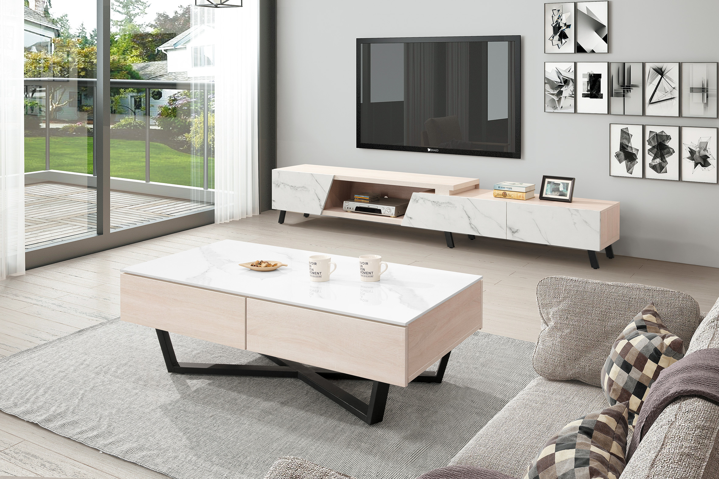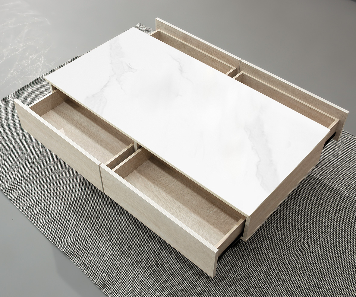 ◆桌面採12mm亮面雪山石岩板面,具耐磨、耐熱特性